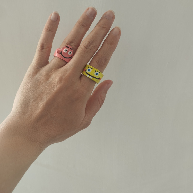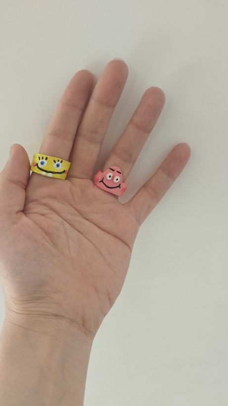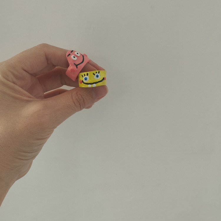 انگشتر جذاب باب اسفنجی و پاتریک یه انتخاب خاص برای هدیه هست و میتوانید با دوستاتون ست کنید.در رنگ ،سایز و کاراکتر مدنظر شما قابل اجرا هست .کاملا دستساز،جزییات کاراکتر برجسته کار شده. از جنس خمیر مجسمه ایتالیالی و نقاشی اکرلیک با کیفیت با پوشش ضداب کیلر.مثل تمام کارهای دستساز بهتره درتمتس طولانی مدت با اب قرار نگیره و درصورت کثیف شدن با دستمال مرطوب تمیز کنید.به دور مواد شیمیایی استون الکل و مواد شوینده